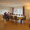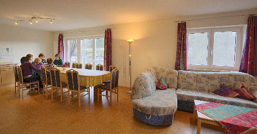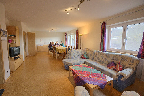 1 Großer Wohnraum (als Aufenthaltsraum für Gruppen geeignet), Küchenzeile mit Spülmaschine u. Mikrowelle