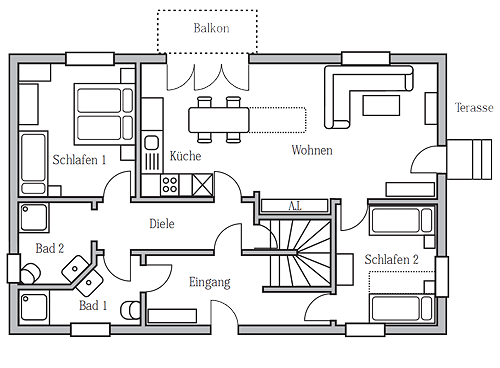 ergeben zusammen unser Ferienhaus für Gruppen bis maximal 16 Personen (16 Betten und 2 Funktionssofas in den Wohnzimmern) mit 2 Wohnräumen, 5 Schlafräumen, 4 Bädern, 2 Balkons und eigener Terrasse.